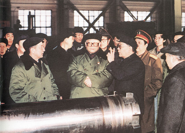 1990年2月17日中共中央总书记江泽民视察127厂时在车间听取汇报