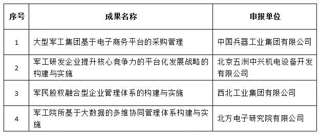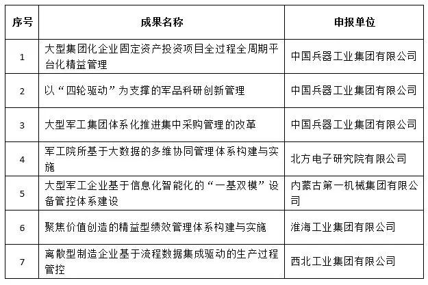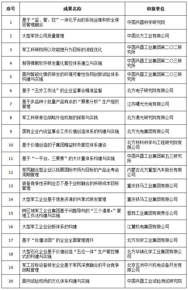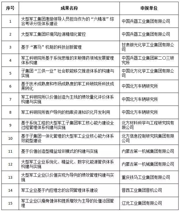 近日,中国兵器工业集团4项创新成果获全国企业管理现代化创新成果奖、42项创新成果获国防科技工业企业管理创新成果奖。 全国企业管理现代化创新成果 经全国企业管理现代化创新成果审定委员会终审,第二十五届全国企业管理现代化创新成果公布,中国兵器工业集团4项创新成果荣获二等奖。 二等奖 国防科技工业企业管理创新成果 2018年度国防科技工业企业管理创新获奖成果名单发布,中国兵器工业集团共获奖42项,其中:一等奖7项,二等奖15项,三等奖20项?;窠弊芰考耙坏冉笔烤挥诰ぜ攀孜?。 一等奖 二等奖 三等奖 据悉,2018年度的国防科技工业企业管理创新评审工作,经专家初审、函审、一等奖候选成果答辩、专家会议评审、评审委员会审核并公示后,评选出一批在履行强军首责、全面贯彻创新驱动发展战略和全面深化改革、高质量发展等方面的优秀成果。本年度共确定获奖成果307项,其中一等奖44项,二等奖126项,三等奖137项。 |