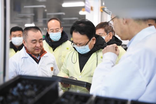 12月9日,吉林省委书记景俊海到中国兵器工业集团东北工业集团有限公司,就深入贯彻党的十九届五中全会精神和习近平总书记视察吉林重要讲话重要指示精神,全面落实省委十一届八次全会精神,推动企业创新发展等情况进行调研。吉林省委常委、副省长吴靖平,吉林省委常委、省委秘书长胡家福,吉林省委常委、长春市委书记王凯一同调研。  图为景俊海等在东北工业集团生产现场调研