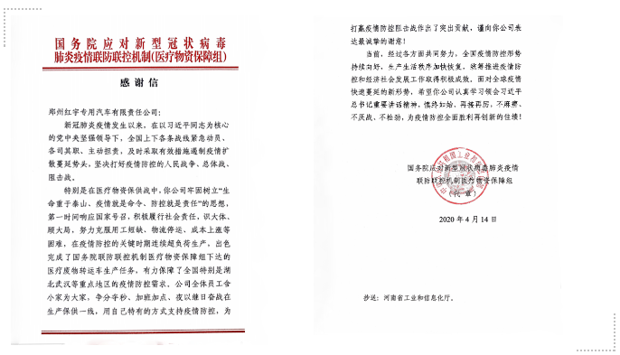 豫西集团郑州红宇专汽公司收到国务院应对新型冠状病毒肺炎疫情联防联控机制医疗物资保障组发来的感谢信
