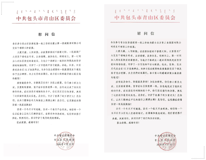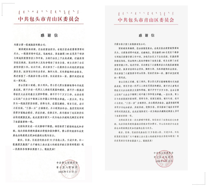 一机集团和北重集团收到中共包头市青山区委员会、青山区人民政府发来的感谢信和慰问信