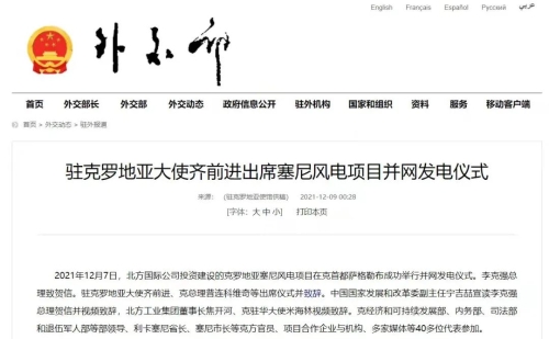 2021年12月7日,中国兵器工业集团有限公司北方公司所属北方国际投资、建设和运营的塞尼156MW风电项目在克罗地亚首都萨格勒布隆重举行并网发电仪式。李克强总理致贺信。克罗地亚总理安德烈·普连科维奇,中国驻克罗地亚大使齐前进出席仪式并致辞。中国国家发展和改革委员会副主任宁吉喆宣读李克强总理贺信并视频致辞,中国兵器工业集团有限公司董事长焦开河、克驻华大使米海林视频致辞。 中华人民共和国外交部报道 普连科维奇总理在致辞中表示,感谢李克强总理发来贺信,他与中国领导人一直非常重视塞尼风电项目投资与建设。祝贺项目克服疫情与地震等影响,成功并网发电。增加清洁可再生能源、绿色电力对克乃至欧洲都很重要,克政府的重要战略和目标之一就是低碳发展和增加清洁能源供应。塞尼风电项目占克总发电量将达3.5%,对克实现2022年可再生能源比例30%目标具有很大帮助。此次投资使北方国际成为在克最大的清洁能源投资企业。非常欢迎更多中国企业扩大对克投资。 宁吉喆宣读李克强总理贺信并视频致辞时表示,2017年11月第六次中国—中东欧国家领导人会晤期间,在李克强总理和普连科维奇总理等中东欧16国领导人的共同见证下,塞尼项目签署了协议。项目既是中国坚定践行绿色发展理念的具体体现,也是中国深化与克罗地亚、与中东欧国家务实合作的生动实践。希望中克两国政府部门,企业等有关各方共同努力、相互配合,运营好塞尼项目,打造出中欧绿色合作的样板,带动两国务实合作持续深入发展,造福两国人民。 焦开河在致辞时表示,在塞尼项目投入运营之际,李克强总理专门致信祝贺。作为塞尼项目的投资方、建设方、运营方,我们备受鼓舞,深感自豪!未来,中国兵器工业集团有限公司将继续深入贯彻落实习近平总书记重要指示批示精神和李克强总理贺信重要要求,以高标准、可持续、惠民生为目标,与克方合作伙伴坦诚沟通、携手并进,进一步推动绿色能源建设,努力打造更多的“一带一路”标志性、引领性、示范性项目,为巩固中克战略合作伙伴关系、推进中克从经贸领域到全方位合作贡献积极力量。 齐前进祝贺塞尼风电项目顺利完工和成功并网发电。他表示,塞尼风电站项目并网发电是中克两国领导人亲自关注和推动的成果。作为迄今最大的中国在克投资合作项目,塞尼风电项目是中克和中欧绿色合作的典范,对克提高清洁能源生产消费发挥着重要作用。项目建设过程中为当地培养了许多工程、技术和管理人才,带动了当地企业发展,增加了就业和税收,促进了当地经济社会发展,充分体现了中国对外经贸合作与“一带一路”倡议秉持的互利共赢、共同发展的理念,也是中国积极倡导的绿色低碳发展合作的典范。 塞尼项目位于克罗地亚中部亚得利亚海沿岸,建设总投资1.79亿欧元,总装机容量156MW,采用39台4MW风力发电机组设备,风场面积达42.8平方公里。项目正式运营后,预计每年平均发电超3000小时,贡献约5.3亿度绿色电力,可减少二氧化碳排放约46万吨,将为克罗地亚促进能源转型、发展绿色经济提供强劲助力,贡献了“中国智慧”“中国方案”。 来源/中华人民共和国外交部、综合有关报道 |
