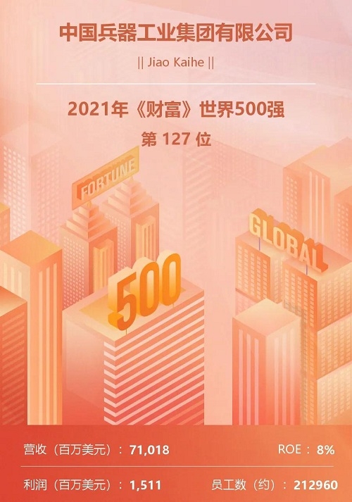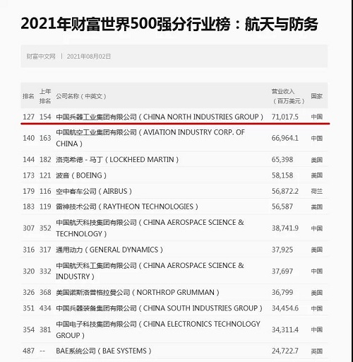 8月2日,2021年《财富》世界500强正式发布。 中国兵器工业集团有限公司位列世界500强第127位,连续12年上榜。 2020年,兵器工业集团党组坚决贯彻习近平总书记重要指示批示精神和党中央、国务院、中央军委决策部署,积极应对世所罕见的“多重冲击”,坚定不移履行好强军首责、军工任务保障指数继续位列军工集团第一,尽锐出战加快核心关键技术攻关、兵器科技创新实现新突破,大力推进民品制造业转型升级、战略性新兴产业培育取得新进展,推动“一带一路”重点项目建设走深走实、国际化经营取得新成果,实现了“十三五”圆满收官,在大战大考中夺取了常态化疫情防控和全面实现年度目标任务“双胜利”,在2020年度中央企业负责人经营业绩考核中获得A级,在2020年度中央企业党建工作责任制考核中获得A档。(财富中文网) |