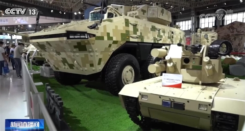 兵器工业集团专家 程子恒:在最中心位展示的是我们VT4系列的重型主战坦克,在旁边我们还看到有一款轮式的无人车。我们的坦克是一个履带式的,在一些特殊泥泞的环境,我们是靠履带行进的,但是我们会发现有一些需要高速行进的场景,轮式有很强的机动性,那么用轮式的无人车高速到前端进行侦查的任务,做一个轮履的相互配合,相互互补。