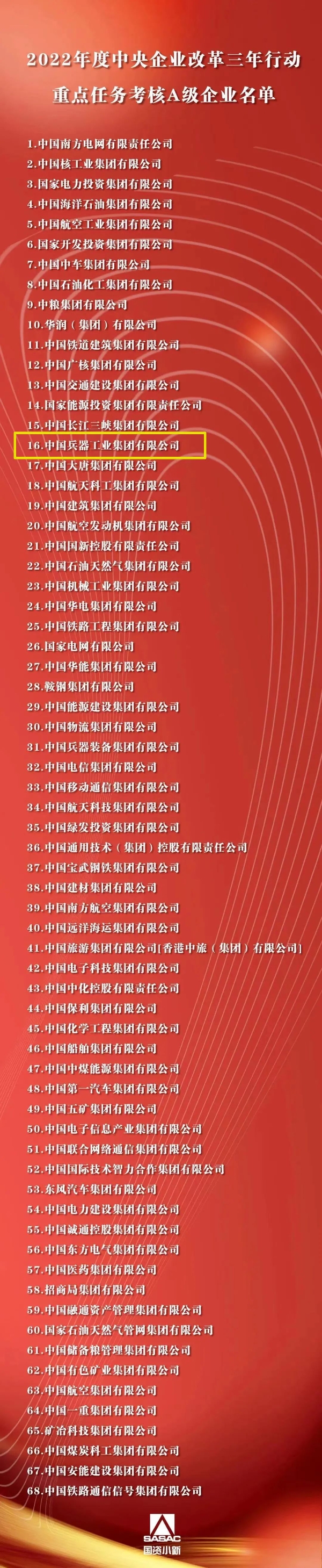 根据《中央企业改革三年行动重点任务考核实施方案(试行)》和《中央企业改革三年行动重点任务考核指标表(2022版)》,经审定,国务院国资委发布2022年度中央企业改革三年行动重点任务考核A级企业名单,中国兵器工业集团有限公司获评A级。