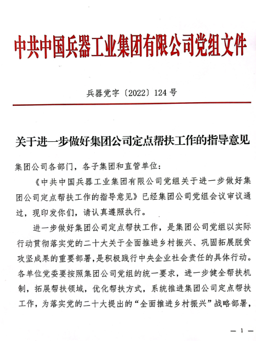 2022年,根据《中共中央 国务院关于实现巩固拓展脱贫攻坚成果同乡村振兴有效衔接的意见》《关于坚持做好中央单位定点帮扶工作的意见》等规定,兵器工业集团党组制订印发《关于进一步做好集团公司定点帮扶工作的指导意见》,形成“1+8+5”兵器特色定点帮扶工作体系。“1”,即围绕“助力全面推进乡村振兴、建设宜居宜业和美乡村”定点帮扶要求,“8”,即“加强系统策划、完善帮扶长效机制,发挥比较优势、助力乡村产业振兴,增强内生动力、助力乡村人才振兴,培育文明新风、助力乡村文化振兴,践行‘两山’理论、助力乡村生态振兴,加强基层党建、助力乡村组织振兴,巩固脱贫成果、加大消费帮扶力度,选派挂职干部、立足乡村建功立业”等八项重点任务,“5”,即加强组织领导、落实帮扶资金、做好宣传引导、增进工作交流、强化考核评价等五方面工作保障。