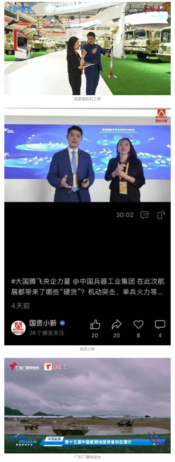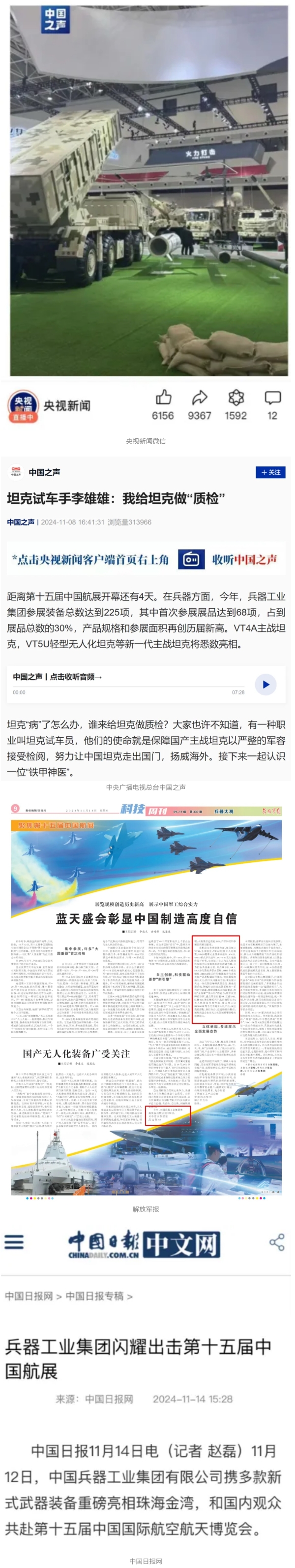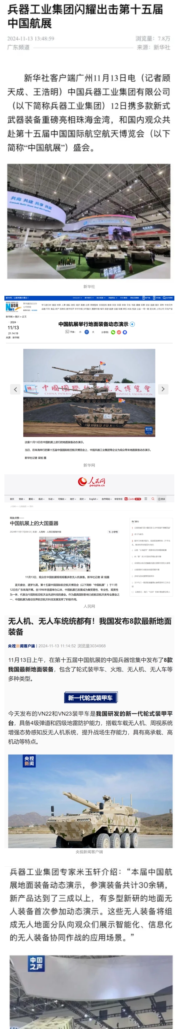 11月13日央视新闻《蓝天之约》直播地面装备动态演示此次航展,央视综合频道《新闻联播》《晚间新闻》、新闻频道《新闻直播间》《新闻30分》《朝闻天下》《共同关注》《东方时空》《午夜新闻》、财经频道《天下财经》《经济信息联播》《正点财经》《第一时间》、中文国际频道《今日环球》《中国新闻》、国防军事频道《军事报道》《正午国防军事》《国防军事早报》《军迷行天下》等栏目共播出兵器工业集团参展相关新闻报道40余条。11月10日央视新闻频道《新闻30分》11月10日央视中文国际频道《中国新闻》11月10日央视国防军事频道《军事报道》11月11日央视国防军事频道《正午国防军事》