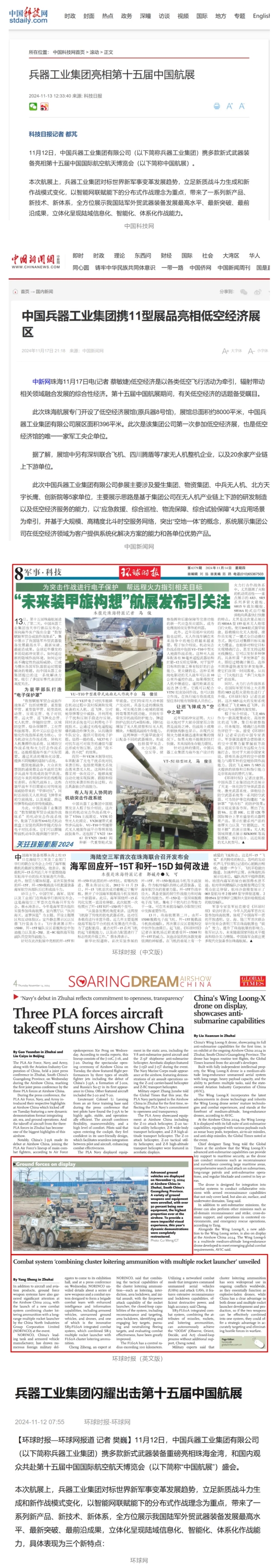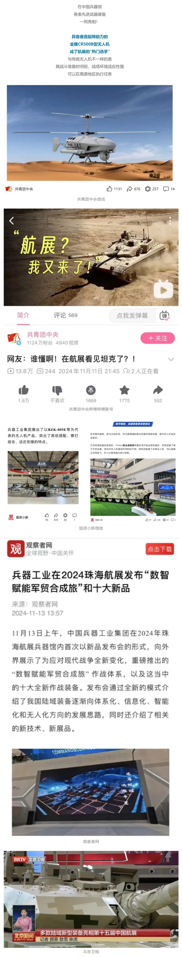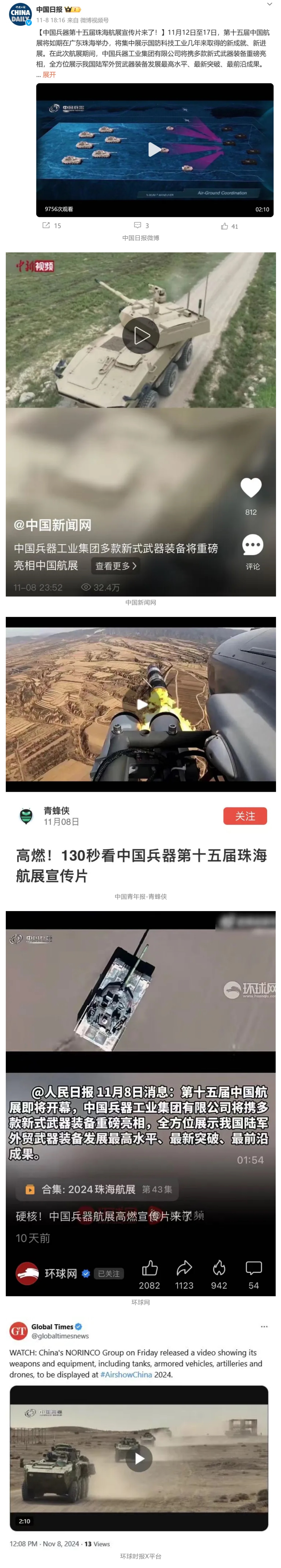 11月13日央视新闻《蓝天之约》直播地面装备动态演示此次航展,央视综合频道《新闻联播》《晚间新闻》、新闻频道《新闻直播间》《新闻30分》《朝闻天下》《共同关注》《东方时空》《午夜新闻》、财经频道《天下财经》《经济信息联播》《正点财经》《第一时间》、中文国际频道《今日环球》《中国新闻》、国防军事频道《军事报道》《正午国防军事》《国防军事早报》《军迷行天下》等栏目共播出兵器工业集团参展相关新闻报道40余条。11月10日央视新闻频道《新闻30分》11月10日央视中文国际频道《中国新闻》11月10日央视国防军事频道《军事报道》11月11日央视国防军事频道《正午国防军事》