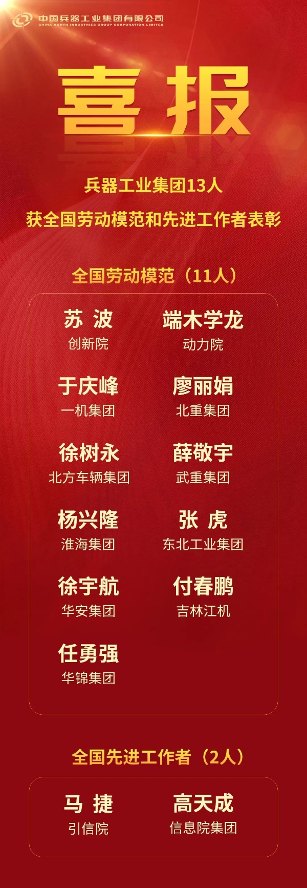 4月28日,庆祝中华全国总工会成立100周年暨全国劳动模范和先进工作者表彰大会在北京举行,大会表彰了1670名全国劳动模范和756名全国先进工作者。中国兵器工业集团有限公司13人荣获表彰,其中全国劳动模范11人、全国先进工作者2人。