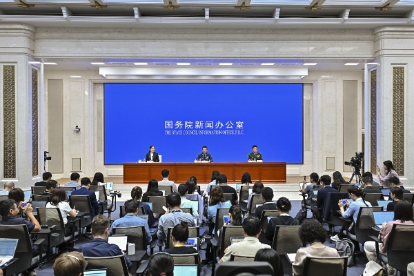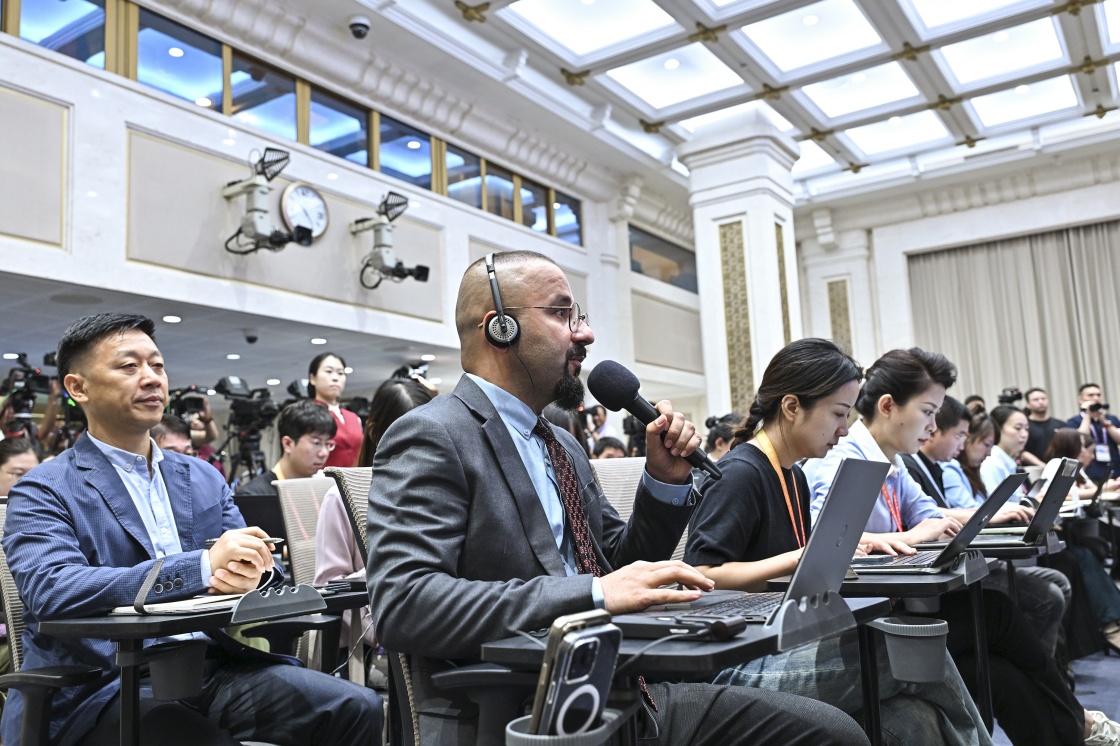 8月20日,国务院新闻办公室在北京举行新闻发布会,阅兵领导小组办公室副主任、中央军委联合参谋部作战局少将副局长吴泽棵,中国人民解放军中部战区阅兵指挥机构办公室常务副主任、政治工作部少将副主任徐贵忠介绍阅兵准备工作有关情况,并答记者问。这是记者在现场提问。